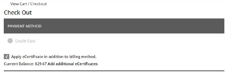 Once you pick your items and head on over to checkout, you will see that the ecertificate is in your “Payment Method”